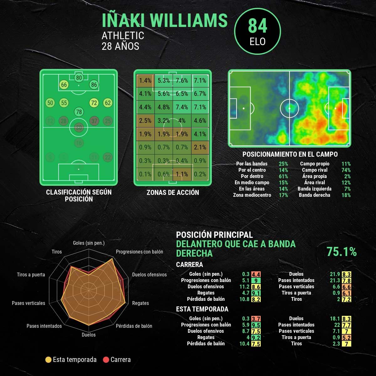 Esa cifra de 5 goles de Iñaki Williams deja difícil la posibilidad de alcanzar su mejor marca en una misma Liga con el Athletic Club. Esa barrera la fijó en la campaña 2018-19, cuando firmó su récord: 14 goles en toda la campaña y 12 de ellos fueron en Liga en 38 partidos disputados. No se perdió ninguno en toda la Liga.