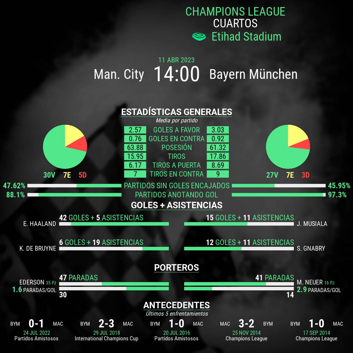 Quizás, el partido más esperado de estos cuartos de final. Dos de los favoritos al título se ven las caras en estos cuartos de final de la Champions League. Vuelve Pep Guardiola a Múnich, la que fuese su casa en el pasado. Regresa Joao Cancelo a Mánchester, de donde salió el pasado mercado después de no tener el rol que esperaba en el Manchester City. Dos equipos en forma, con entrenadores con un libreto parecido y con la clara vocación ofensiva de buscar la portería rival. Bajo ese manto asoma este Manchester City-Bayern de Múnich.
