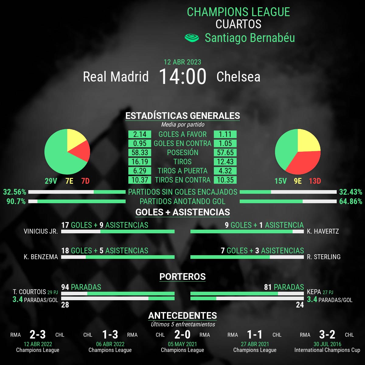 Será el octavo enfrentamiento histórico entre Real Madrid y Chelsea. Hasta ahora, el Real Madrid se ha apuntado 1 victoria, mientras que el Chelsea cuenta cuatro. Además, dos empates completan ese historial. Los dos primeros choques datan de la Recopa de 1971, con 1-1 y 2-1 para el Chelsea. En la Supercopa de Europa de 1998, el cuadro blue se impuso de nuevo por 1-0. En las semifinales de la 2020-21, 1-1 en el Santiago Bernabéu y 2-0 en Stamford Bridge. En el curso pasado, 1-3 en Inglaterra y 2-3 en la vuelta en España tras prórroga.
