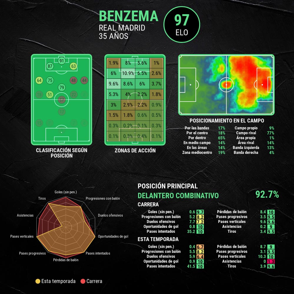 En el equipo blanco estaca la figura del ya mencionado Karim Benzema. El galo, sin atravesar su mejor estado de forma, comanda al Real Madrid en goles gracias a sus 11 dianas en el torneo de la regularidad. Eso sí, el francés está siendo bien escudado por un Vinicius que es el mejor hombre de Carlo Ancelotti en facetas como los regates exitosos (141), las faltas recibidas (86), los pases clave (21) o los duelos ganados (317).