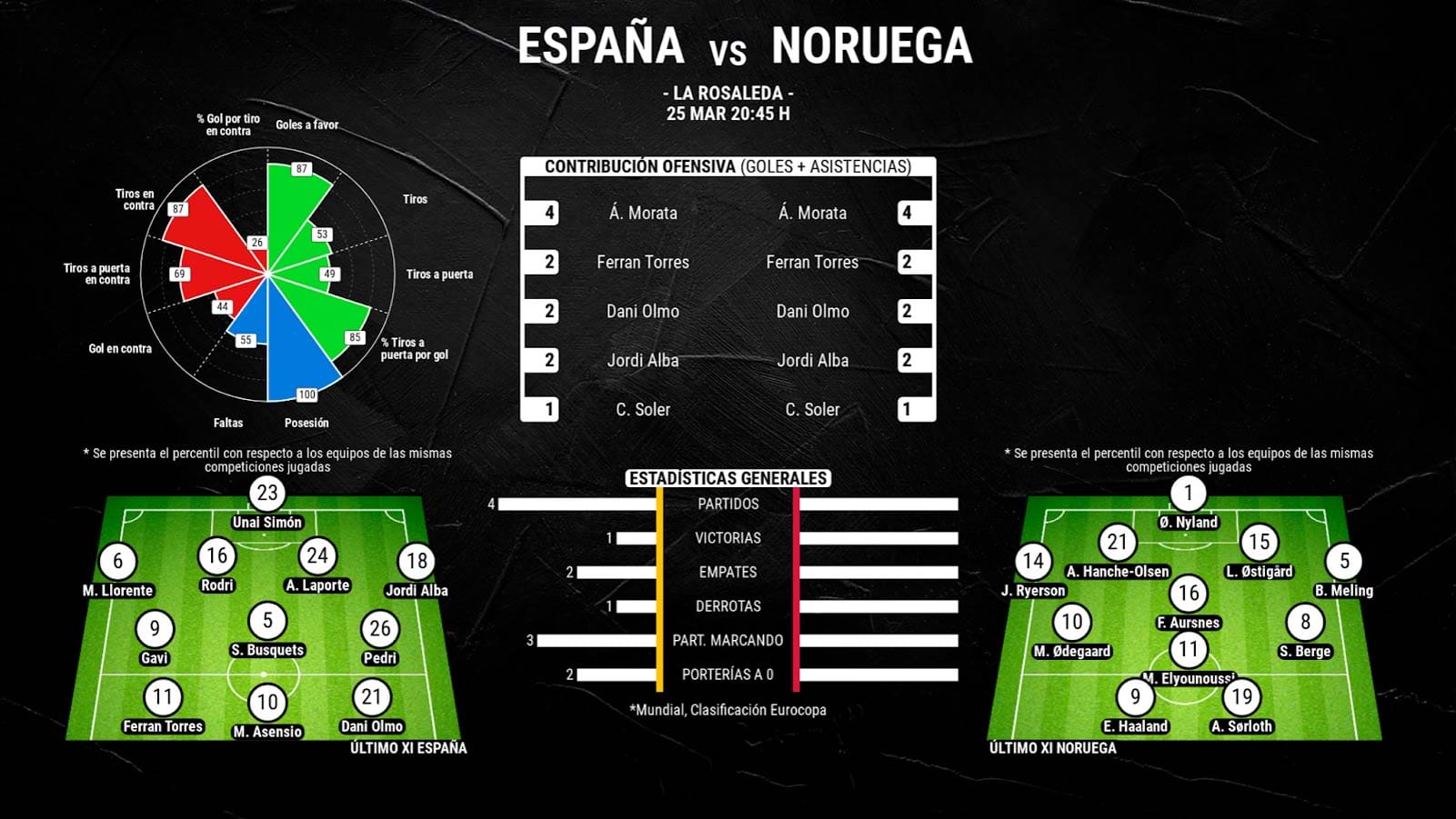 Así que en este primer juego del sábado 25 de marzo, la Selección Española se enfrenta ante la temerosa selección nórdica liderada por temibles nombres como son los de Erling Haaland, Sorloth y Martin Odegaard. Un equipo que cuenta con los mejores nombres hasta la fecha que se han visto en el equipo nacional noruego y que hacen que los españoles tengan que estar en alerta ante tan complejo plantel.