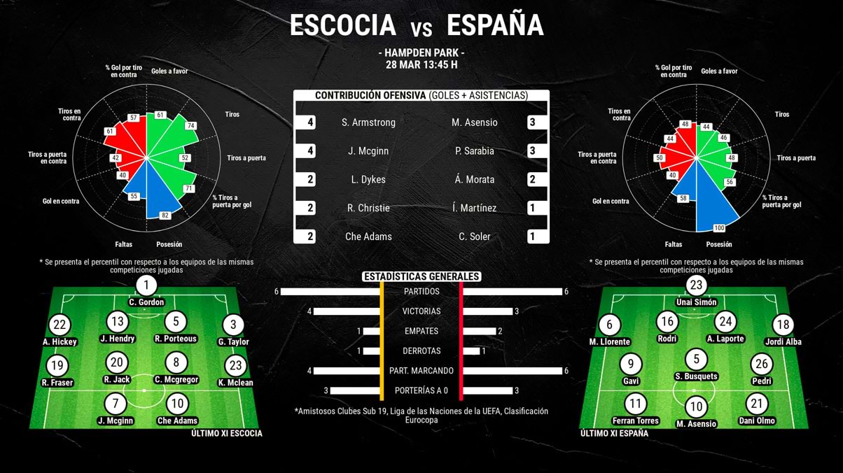También, en un partido en el que todo parece ser más sencillo, aunque habrá que ver, los hispanos chocan ante Escocia, otro equipo cuyo nombre estelar es el del lateral izquierdo de Liverpool Andy Robertson, que junto a otros nombres como el de Che Adams, prometen tampoco ponérselo fácil al conjunto de Luis de la Fuente.