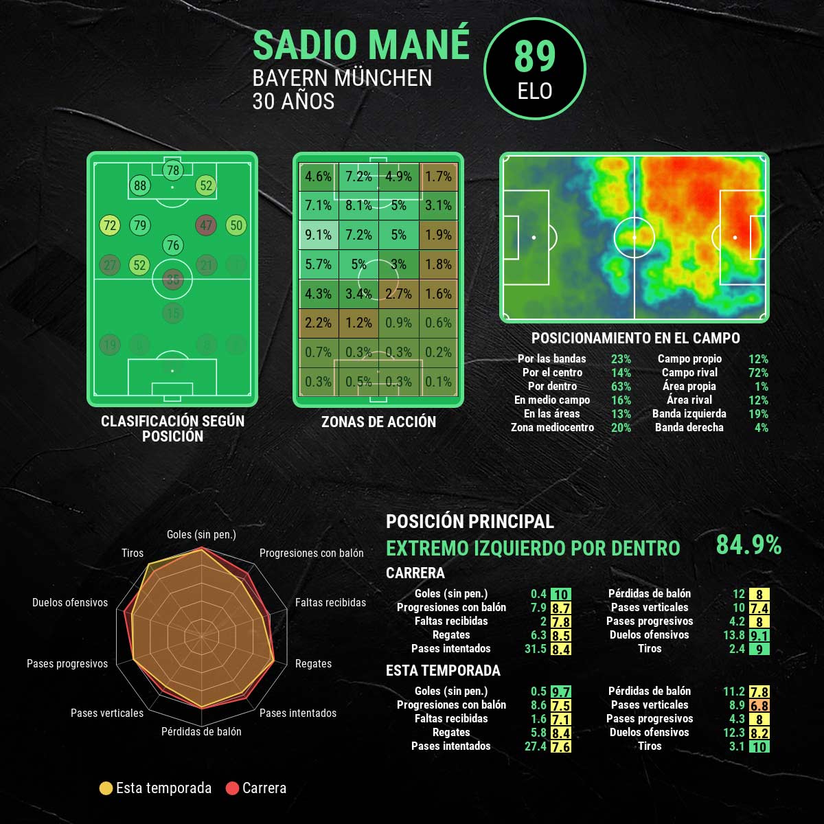 Sumando estos dos partidos como suplente tras su inoportuna dolencia, Sadio Mané ha disputado un total de 25 encuentros con el Bayern de Múnich, 21 de ellos como titular, en los que ha completado 1.671 minutos. En ellos, el delantero tuvo tiempo de marcar 11 goles (6 en Bundesliga) y de dar 4 asistencias. Otras 3 dianas las repartió en Champions League, donde ahora puede reaparecer a tiempo para buscar la sentencia ante el Paris Saint-Germain.